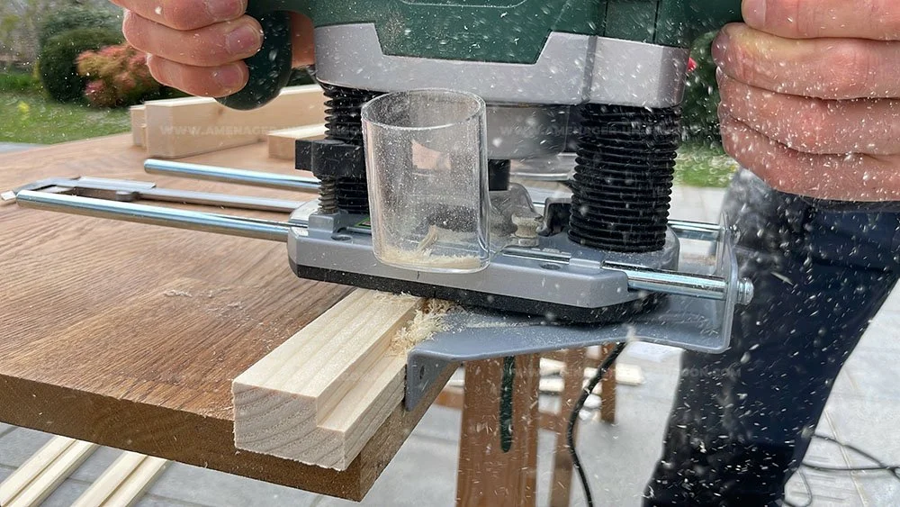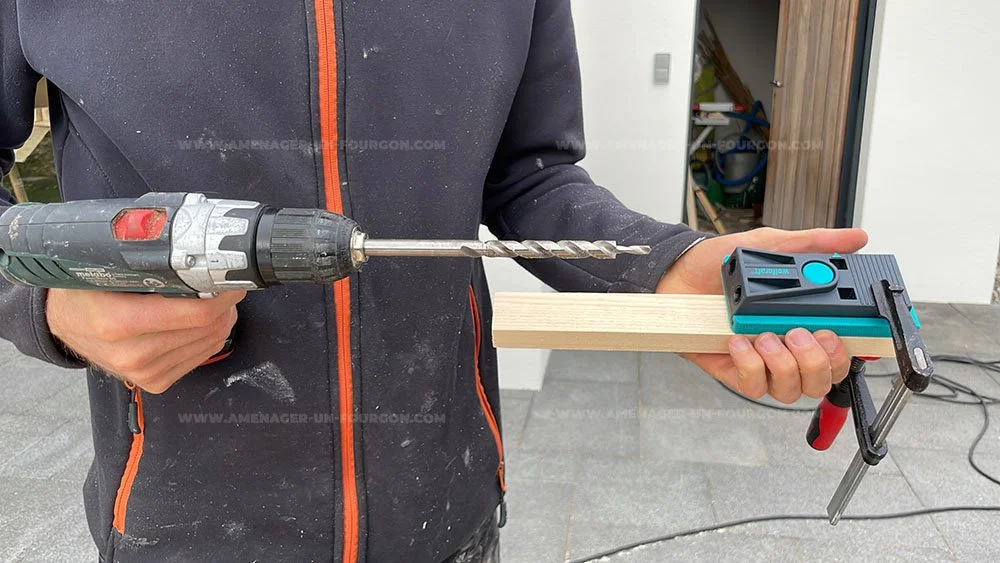 On débute les travaux par la réalisation d’un cadre en tasseaux aux dimensions souhaitées et qui formera la face avant du placard. Pour cela nous avons utilisé un guide pour réaliser des trou de poche pour obtenir un assemblage avec des vis invisibles. Il existe des kits peu onéreux en magasin de bricolage. Nous avons aussi réalisé une feuillure (à l’aide d’une défonceuse) le long du tasseau du bas pour pouvoir coller à ras et maintenir solidement la planche de contreplaqué du dessous.