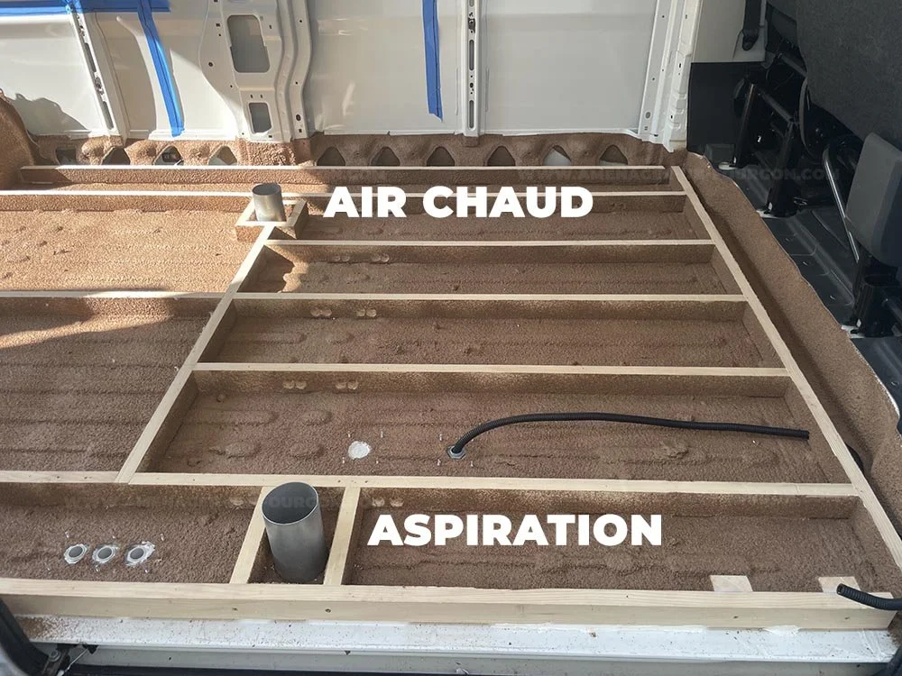 Comme précisé plus haut, il est très important de réfléchir à cette étape très tôt et notamment avant d’installer le chauffage. Il n’y a pas beaucoup d’espace sous le véhicule, il faut donc être malin et vérifier que les grosses gaines d’air pourront être installé de façon judicieuse et saine.