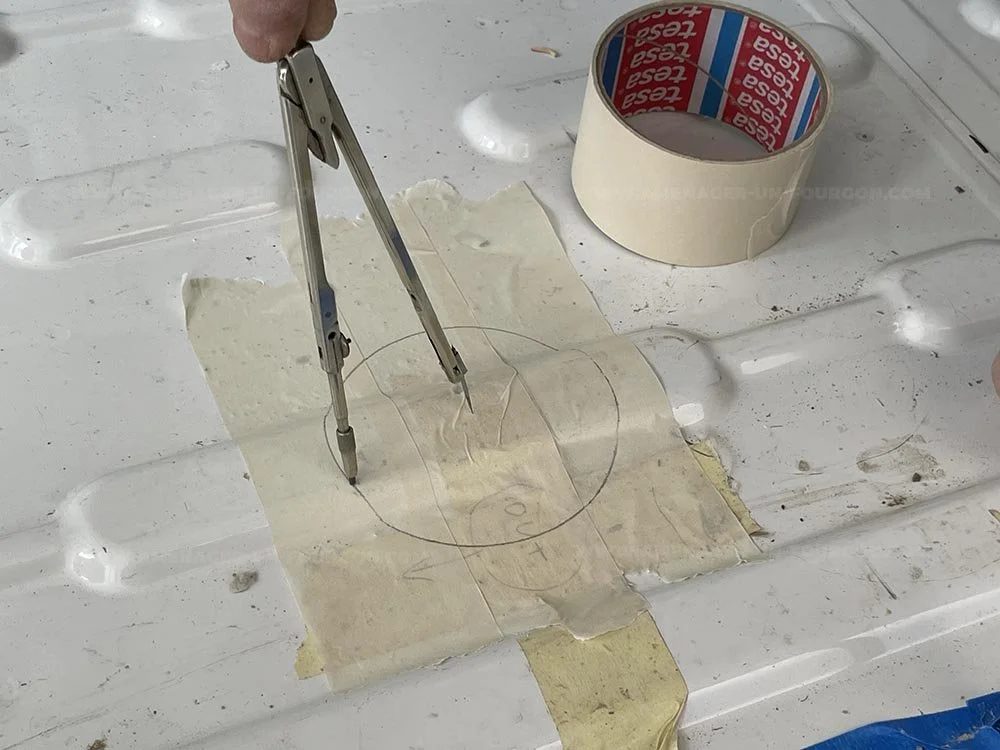 Un plan est fourni avec le Webasto, ce qui permet de facilement tracer les trous à faire. Comme nous avons changé plusieurs fois d’idées d’emplacement, nous avons du recommencer les perçages de sorte à pouvoir installer l’Evo 40 dans les deux sens sur le support.