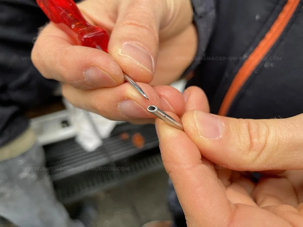 Il faut courber le tube en suivant le schéma, puis le couper à la bonne longueur, ici 295mm après l’avoir courbé. Nous vous recommandons de faire une découpe en biais afin d’optimiser l’aspiration du gasoil. Un petit tournevis vous aidera à rendre la finition de la découpe plus propre.