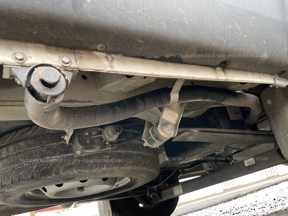 Vous pouvez voir sur la photo ci-dessous la proximité entre le trou d’échappement des gaz brûlés et les lames de suspension du véhicule. Cette proximité ne nous semblait pas trop problématique lors de l’installation. Cependant, il s’est avéré qu’elle le soit et nous devons réfléchir aujourd’hui à l’éventualité de devoir reculer le chauffe eau. En effet, lorsque la suspension est trop sollicité, les lames viennent heurter le conduit d’échappement.