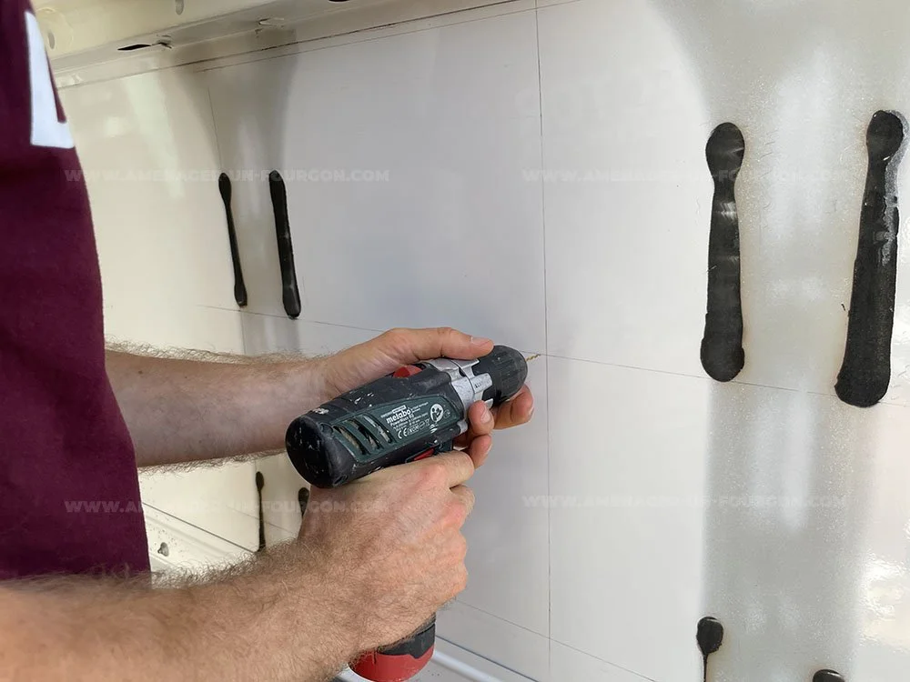 Nous vous conseillons de commencer par tracer et percer le centre de la baie depuis l’intérieur. Cela vous permet d’avoir une petit marge d’erreur si vous remarquez que la position ne convient pas tout à fait, et surtout, il est toujours préférable de travailler à partir d’un axe central.