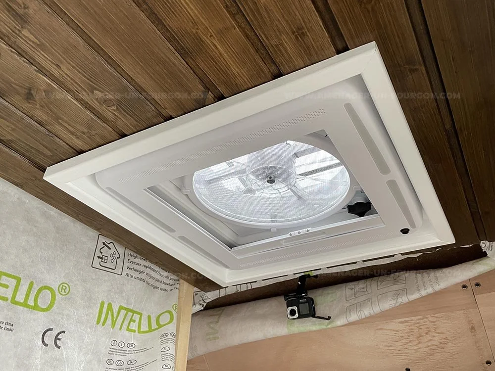 Notre lanterneau avant est doncle Maxxfan Deluxe. Celui-ci est motorisé et équipé d’une ventilation. Il s’ouvre et se ferme lorsque l’on souhaite soit extraire l’air de véhicule, soit injecter de l’air extérieur à l’intérieur. Nous nous en servons donc à la fois pour jouer le rôle de hotte aspirante pour la gazinière, mais aussi pour renouveler l’air et ventiler l’habitacle.