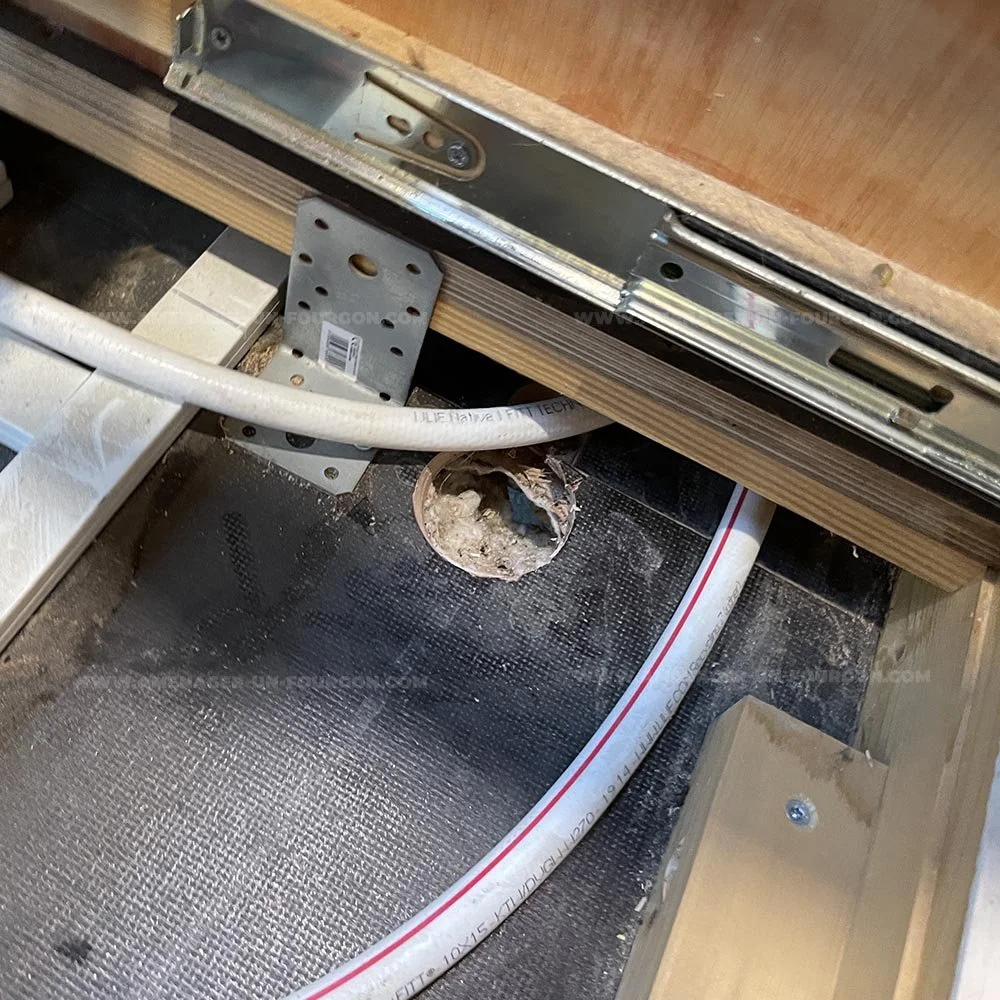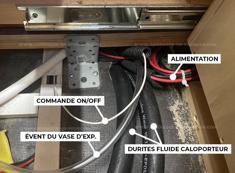 Nous avons pu faire passer les durites par un trou déjà existant sous notre véhicule. En effet, lors des premiers travaux d’aménagement, nous avions réalisé plusieurs passages mais certains se sont avérés être inutiles. Nous les avions donc rebouché à l’aide de Sikaflex et de plaques en aluminium. Ce passage situé dans le meuble droit tombait à pique ! Il était parfaitement situé et dimensionné pour accueillir les deux grosses durites de fluide caloporteur, les deux gaines pour les branchements électriques, ainsi que l’évent.