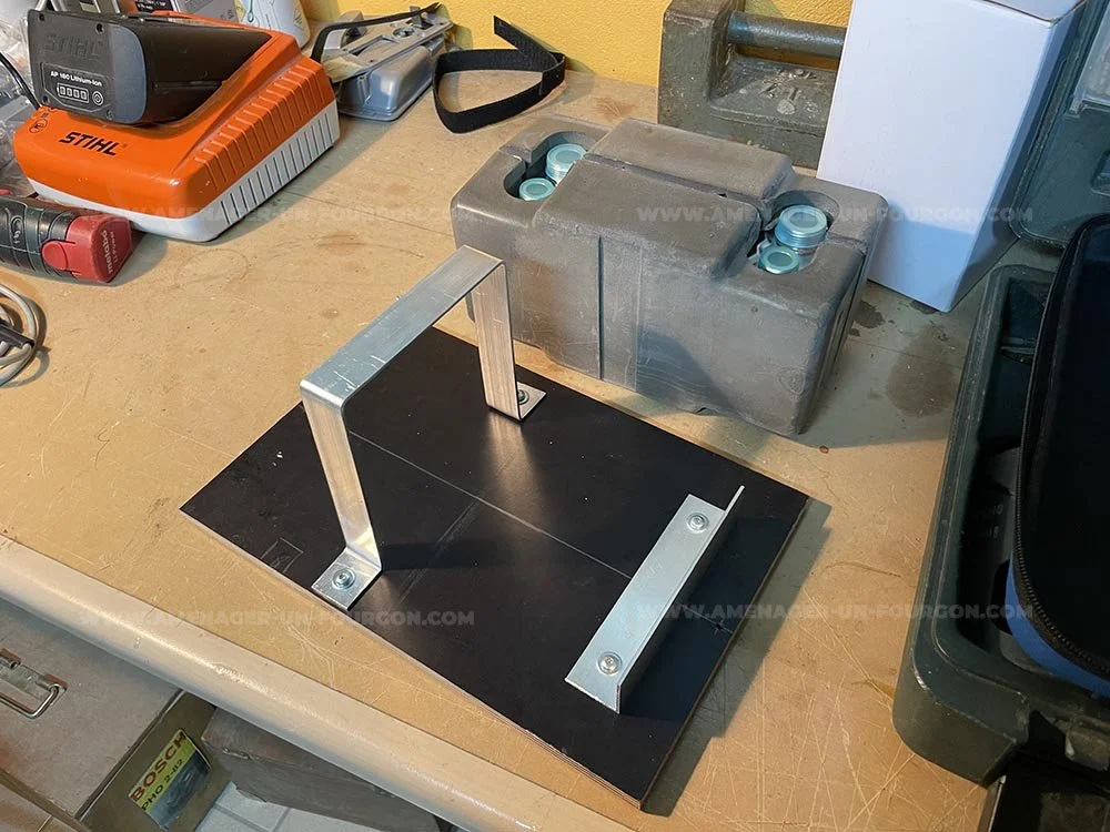 Le Thermo Top Z est fixé à un support en métal sur mesure qu’il serait dommage de ne pas utiliser car en plus d’offre des points d’encrage, il protège la chaudière des chocs. Cependant, un des trois points de fixations de ce support n’est pas sur le même plan que les deux autres. Il est donc nécessaire de fabriquer un petit support complémentaire à l’aide d’un profilé en aluminium.