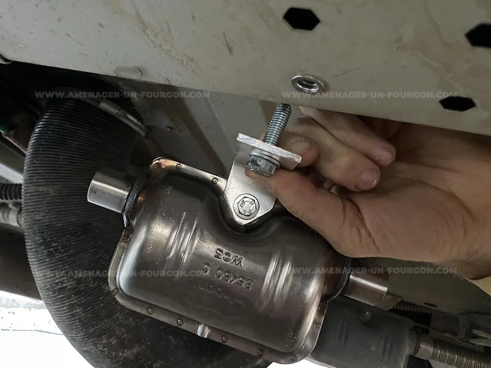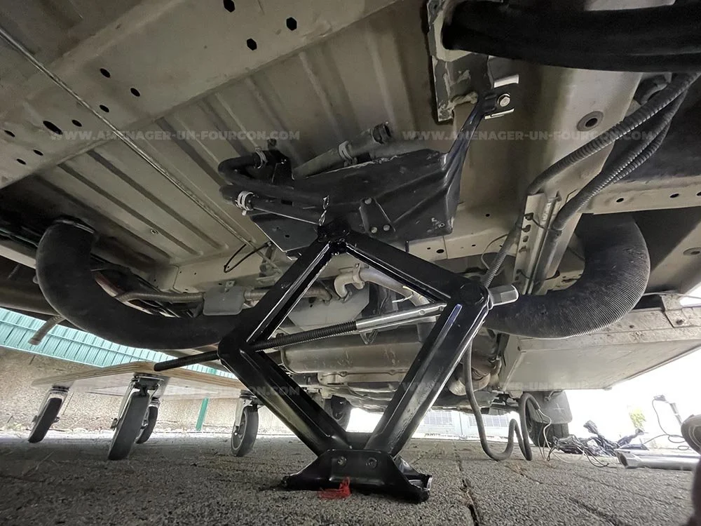 Nous avons opté pour un positionnement proche de notre chauffage Webasto Evo 40, en position centrale avant du véhicule, et bien protégé avec peu de déport vers le sol. Attention également à la tringle de commande du frein à main !