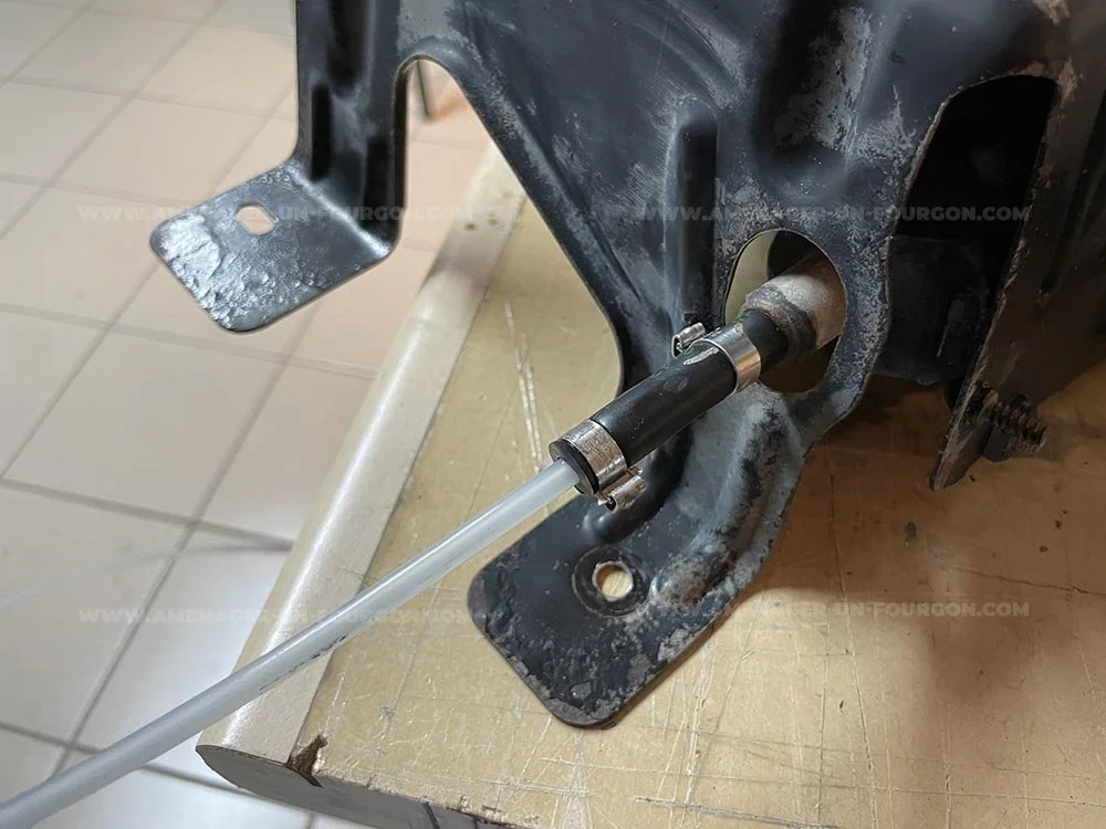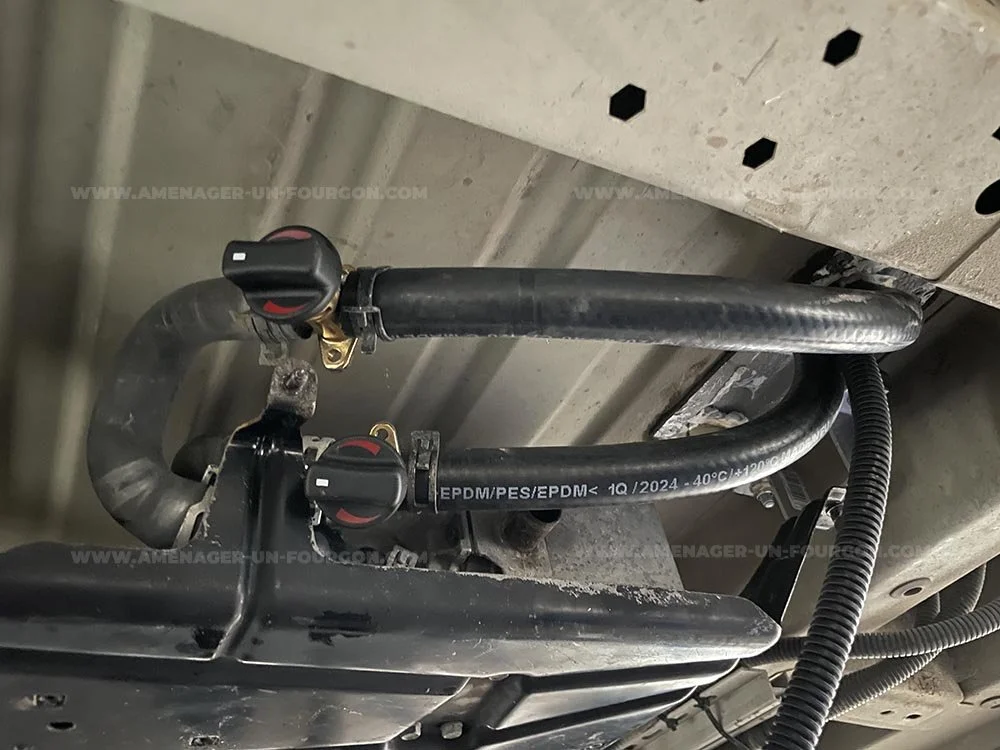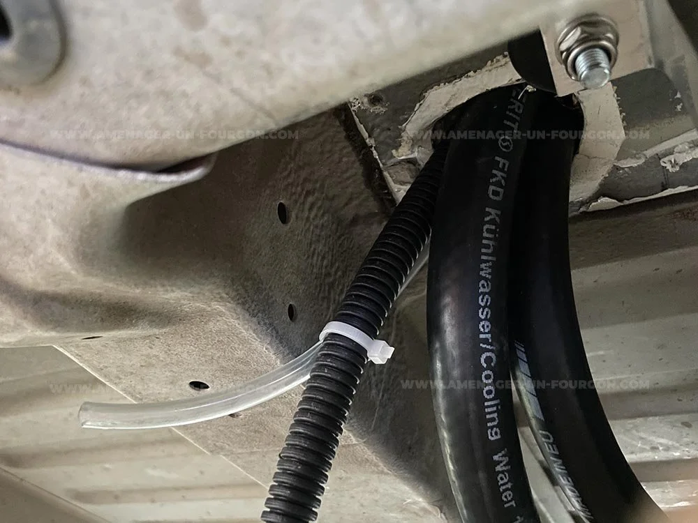 Il me semble que nous avons coupé et inversé les deux durites afin d’avoir une orientation adaptée à l’emplacement du trou dans le sol du fourgon.