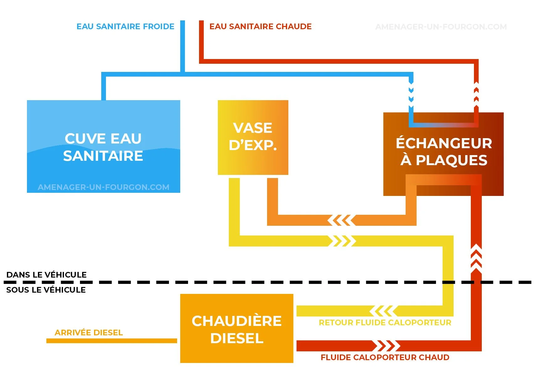 Nous avions comme idée d’installer un système avec un échangeur à plaque car plusieurs amis voyageurs utilisaient cette solution et en étaient très satisfaits : eau chaud (brulante s’il faut) en continu et en seulement 3-4 minutes.