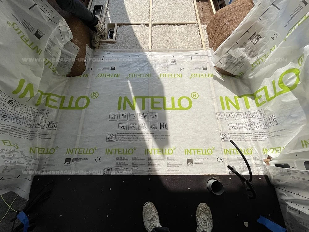Le pare-vapeur est une membrane très étanche qui bloque quasiment toute la vapeur d’eau avant qu’elle n’atteigne l’isolant ou la tôle du véhicule. Son objectif est de créer une barrière hermétique pour éviter toute condensation interne.