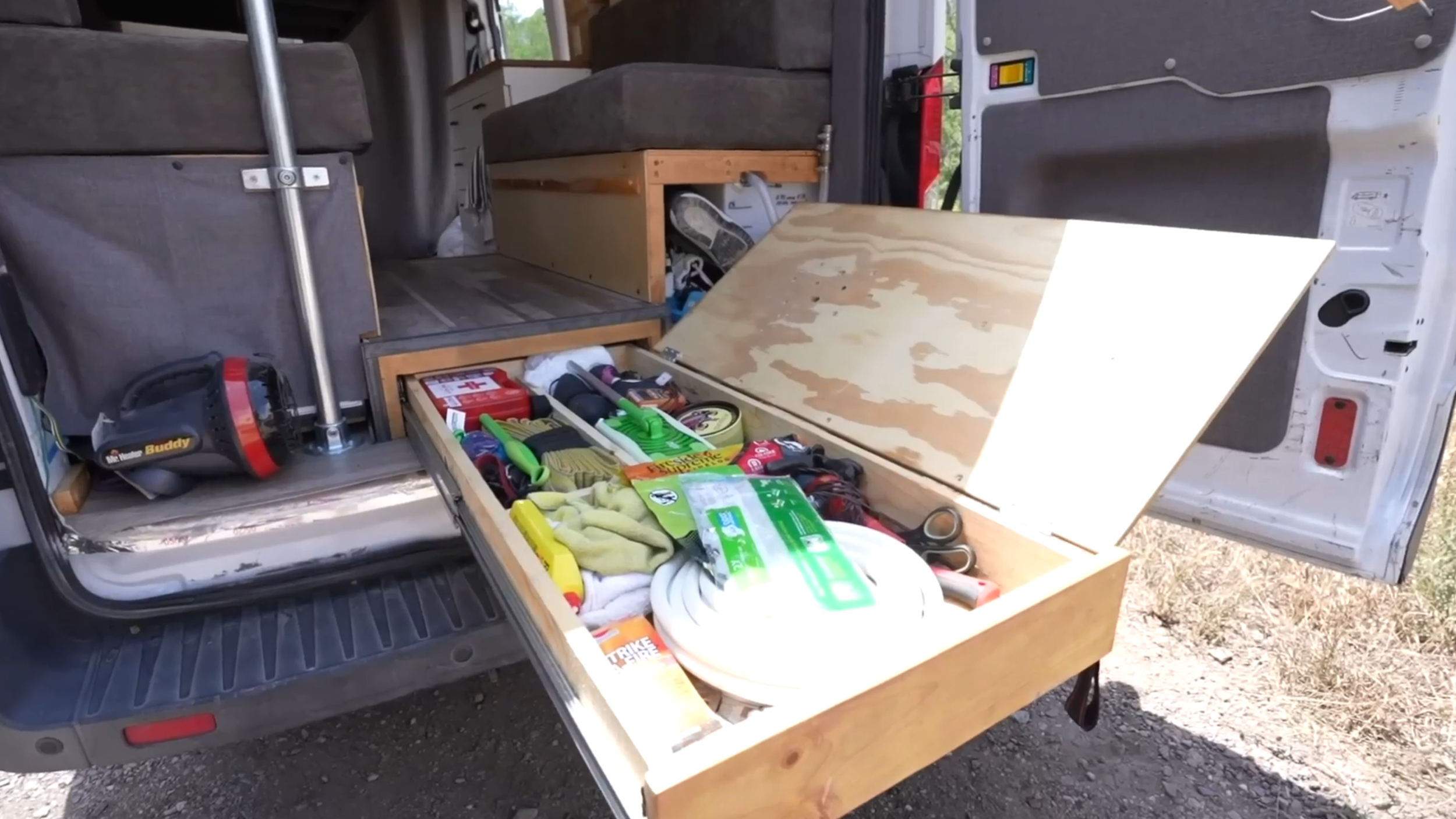Elle a également un tiroir de coffre pratique pour toutes les affaires qu’elle n’utilise pas au quotidien. Le tiroir se tire puis s’ouvre par le dessus. Quand le couvercle est fermé, elle utilise cet espace pour préparer son sac de randonné.